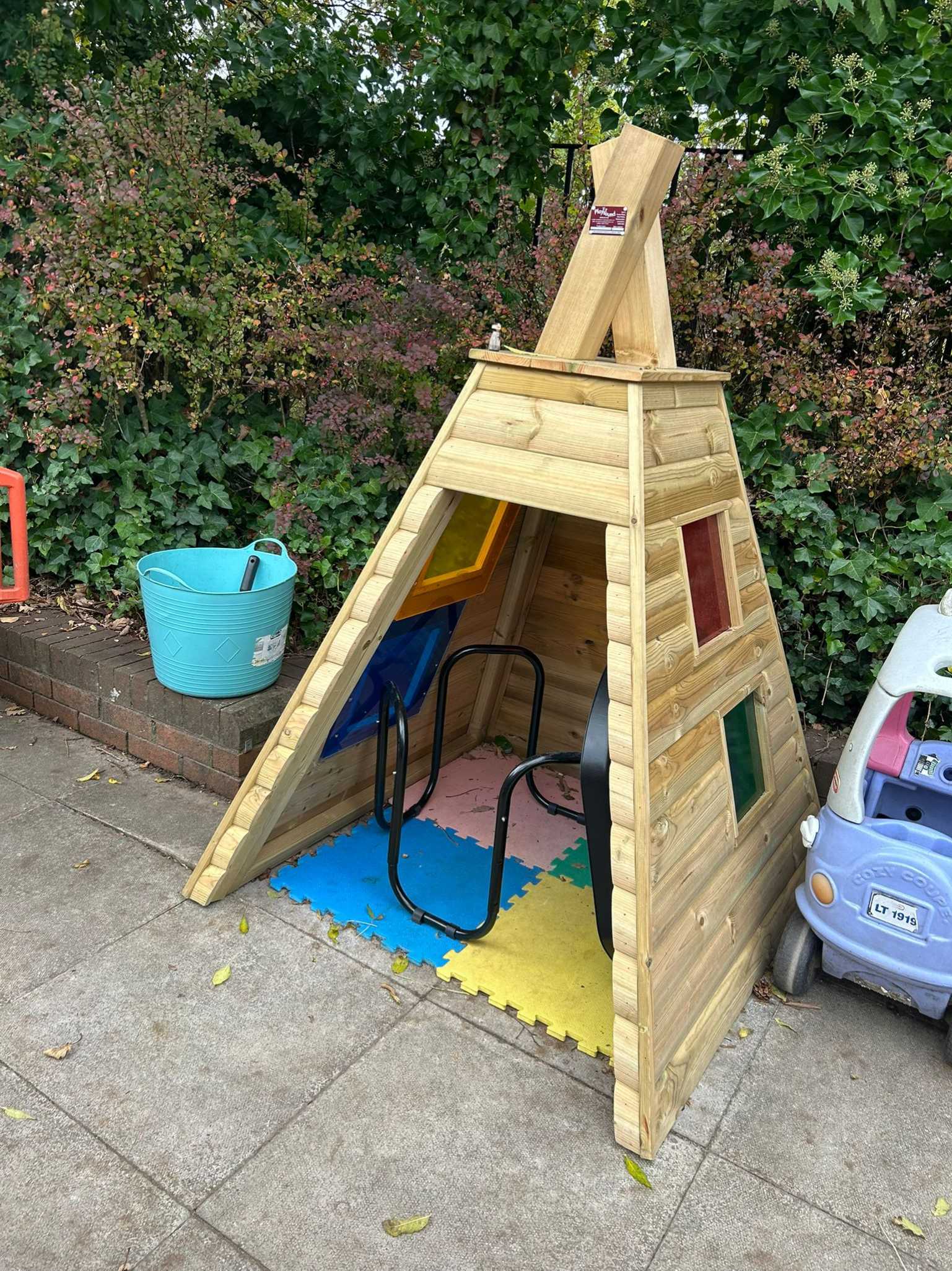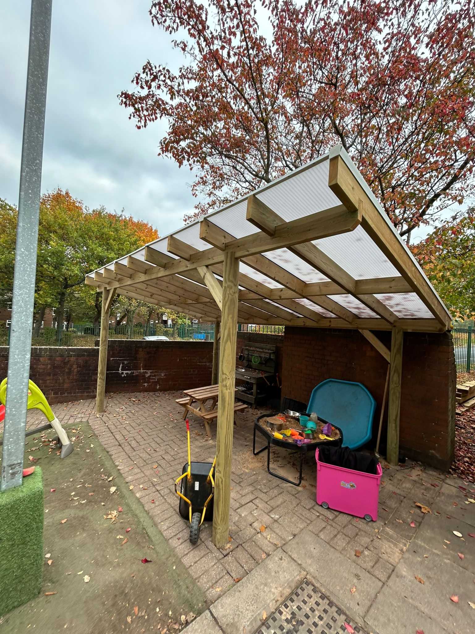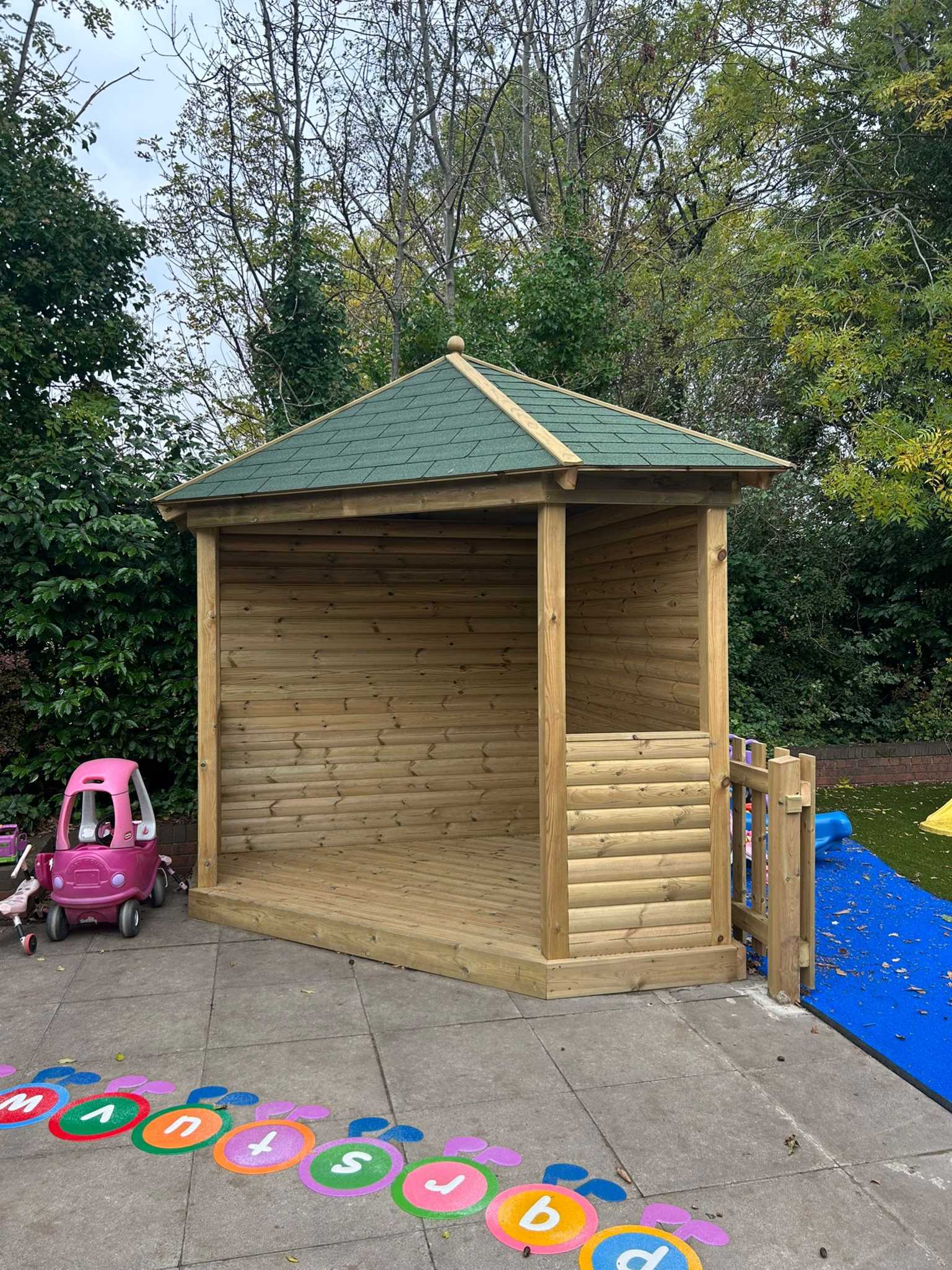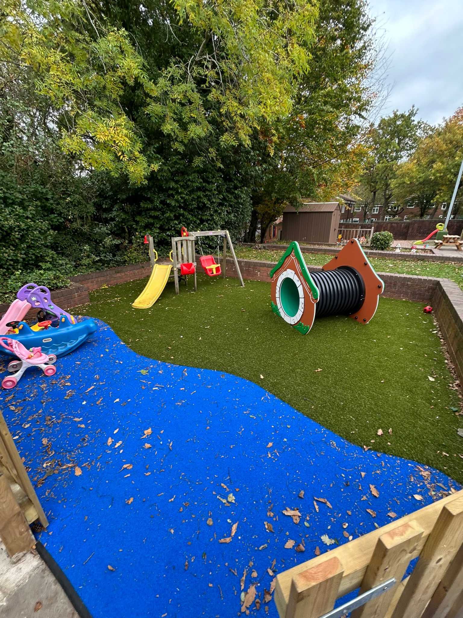 To maximise the nursery’s existing space, we created a dedicated play zone featuring a combination of green and blue artificial grass instantly transforming the area into a bold, safe, and engaging environment for play. Our high quality artificial grass surfacing provides a soft, durable base for children to enjoy, while the addition of sheltered equipment ensures the fun doesn’t stop when the weather changes.