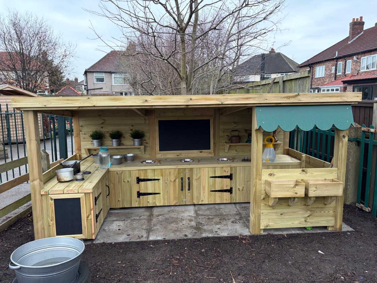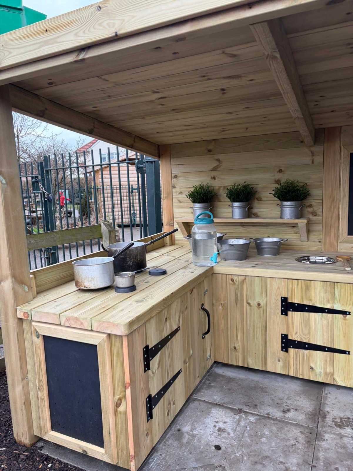 Mud play offers a wide range of valuable developmental benefits for young children, supporting both physical and cognitive growth through hands on exploration. Using a mud kitchen encourages imaginative role play as children create recipes, take on different roles, and interact with their peers, helping to build communication skills, cooperation, and confidence. Scooping, pouring, mixing, and transferring materials also strengthens fine and gross motor skills, hand eye coordination, and spatial awareness, while exposure to natural materials promotes sensory development and curiosity about the world around them. Through experimenting with textures, quantities, and cause and effect, children naturally develop early problem solving and mathematical concepts, making mud kitchen play a rich and engaging way to learn through outdoor experience.