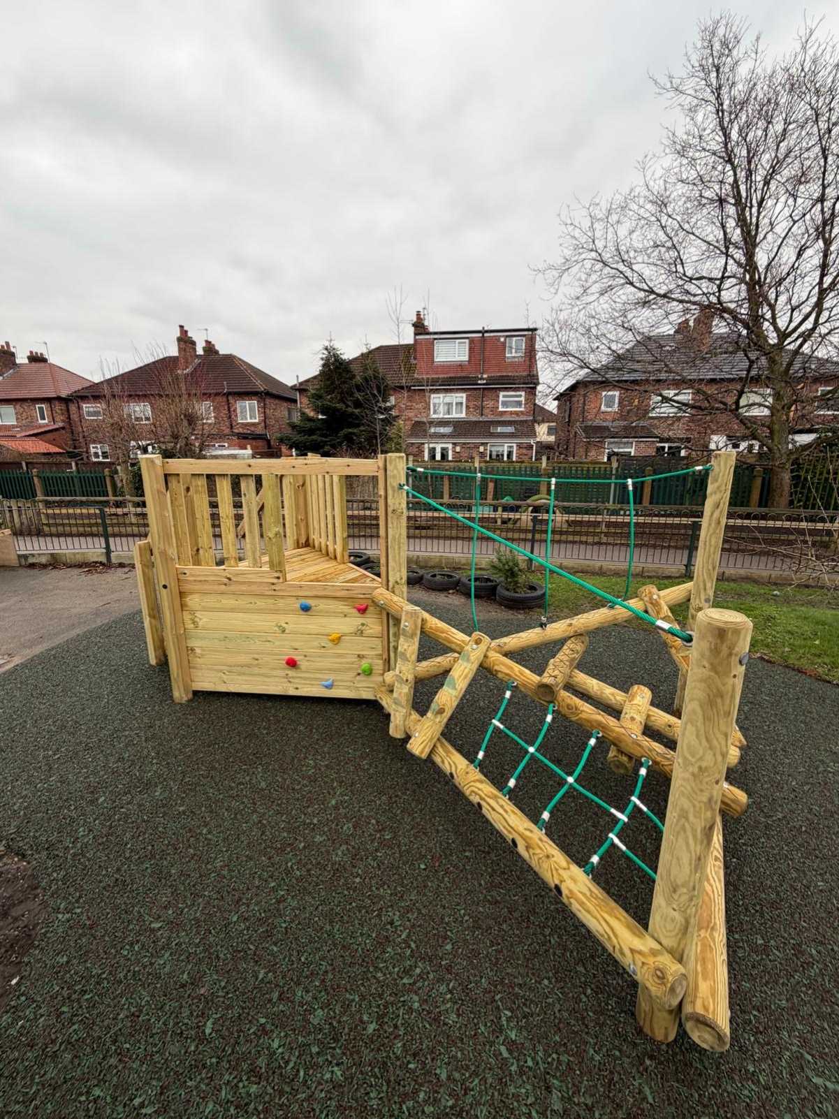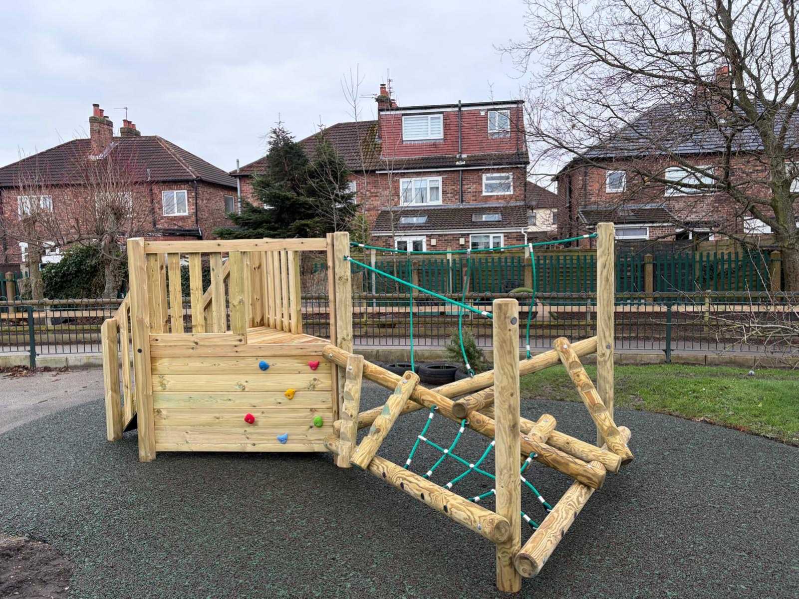 The first area was designed to promote active play while fitting neatly into the designated space around the existing mound. This proved to be the ideal location for our popular Clamberstack Midi with deck, rock traverse, and steps (this product is usually fitted with a HDPE slide, but through requirements we swapped this out for steps).To complete the space, we resurfaced the area with resin bonded mulch, creating a durable, safe surface that also blends beautifully with the natural surroundings.