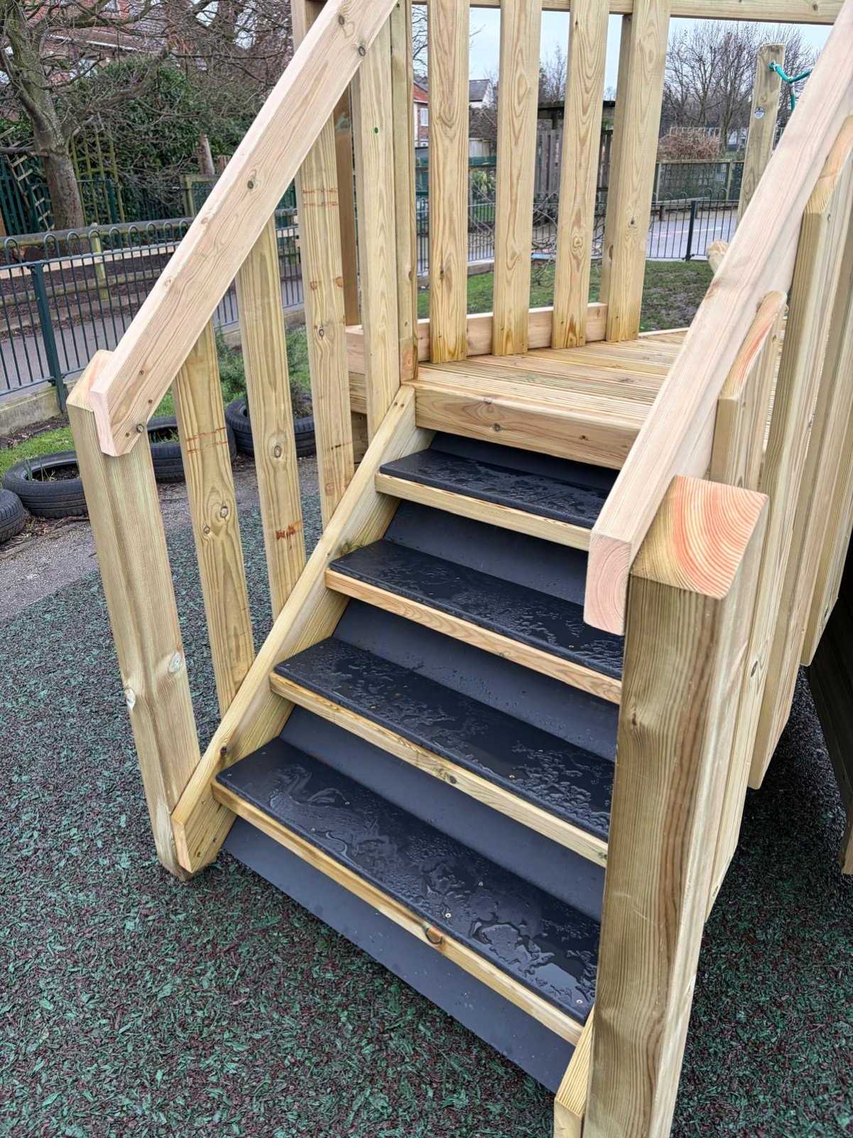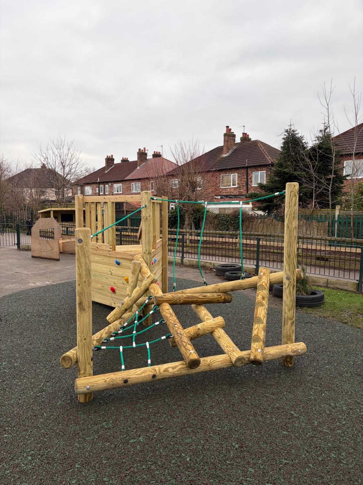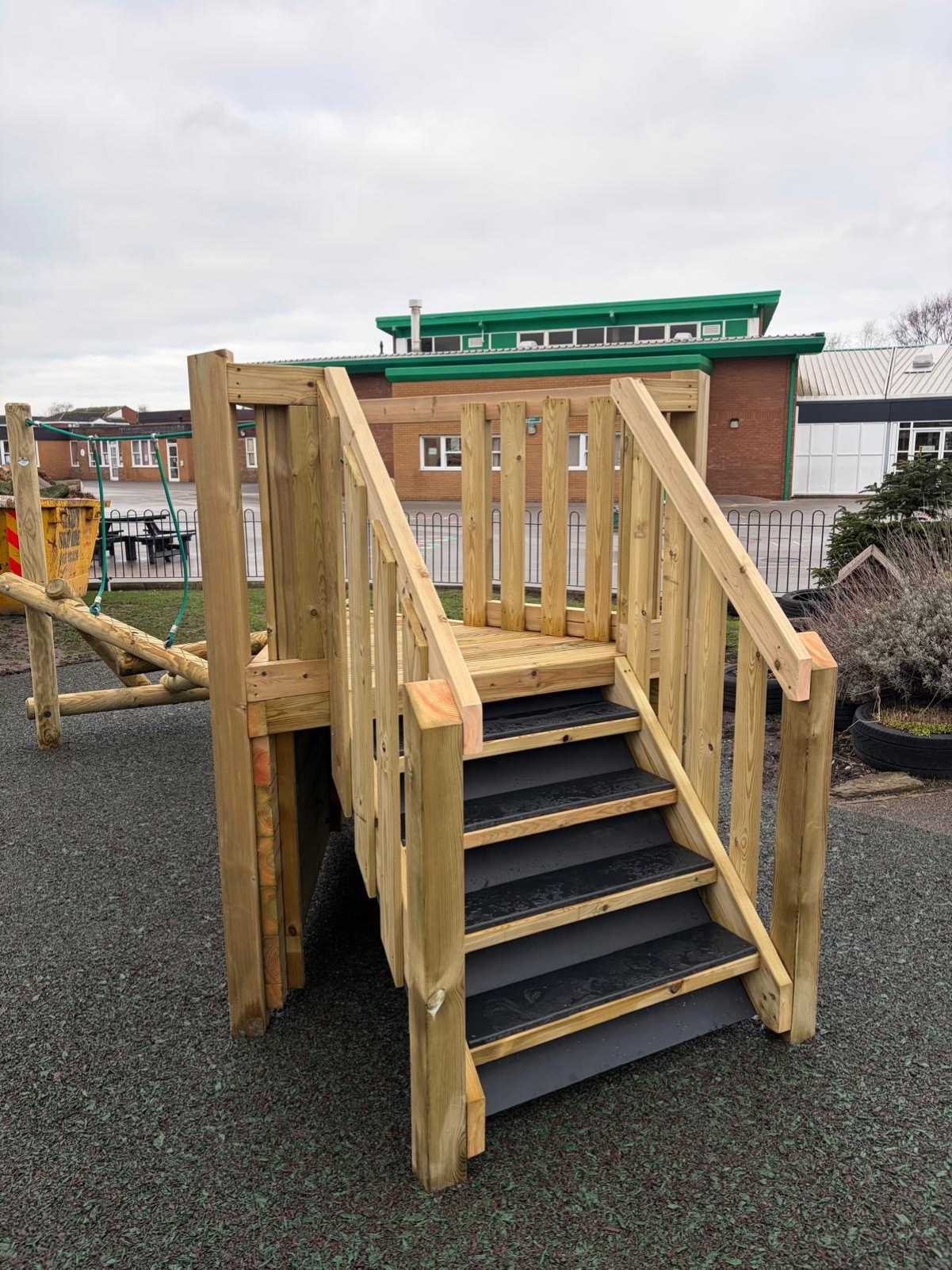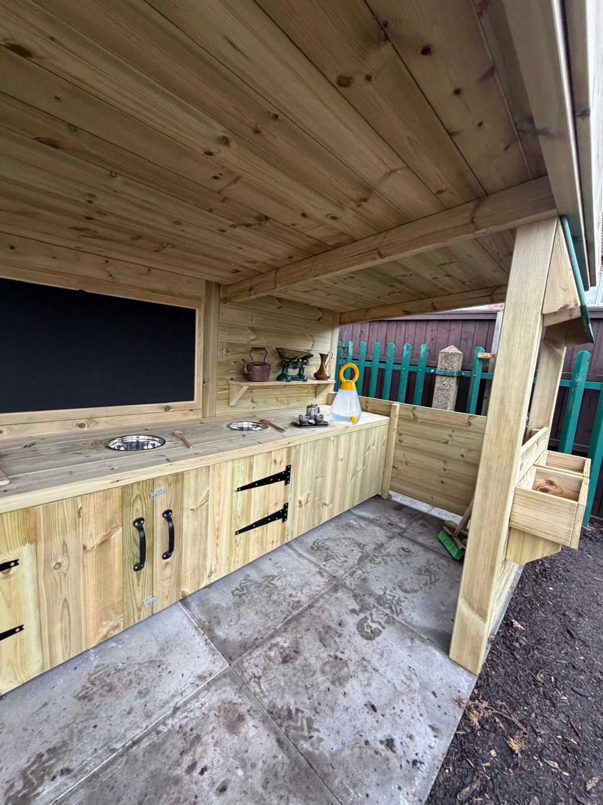 In a separate area of the school, the focus was on enhancing a used space where children regularly engaged in bucket play and messy activities, leading the school to express interest in one of our mud kitchens. We proposed our Mud Kitchen 4 with a number of bespoke adaptations to suit the site, as the installation could not exceed a specific height because of neighbouring boundaries. Because we manufacture our equipment in-house, we were able to lower the roof to a height still perfectly suited for reception age children, widen the structure to span the available space, and incorporate a small chalkboard for mark making as an added creative feature. Beneath the mud kitchen, we installed flag paving to create a solid, durable surface, ensuring that even in wet or muddy conditions the area remains practical and safe so outdoor messy play can continue all year round.