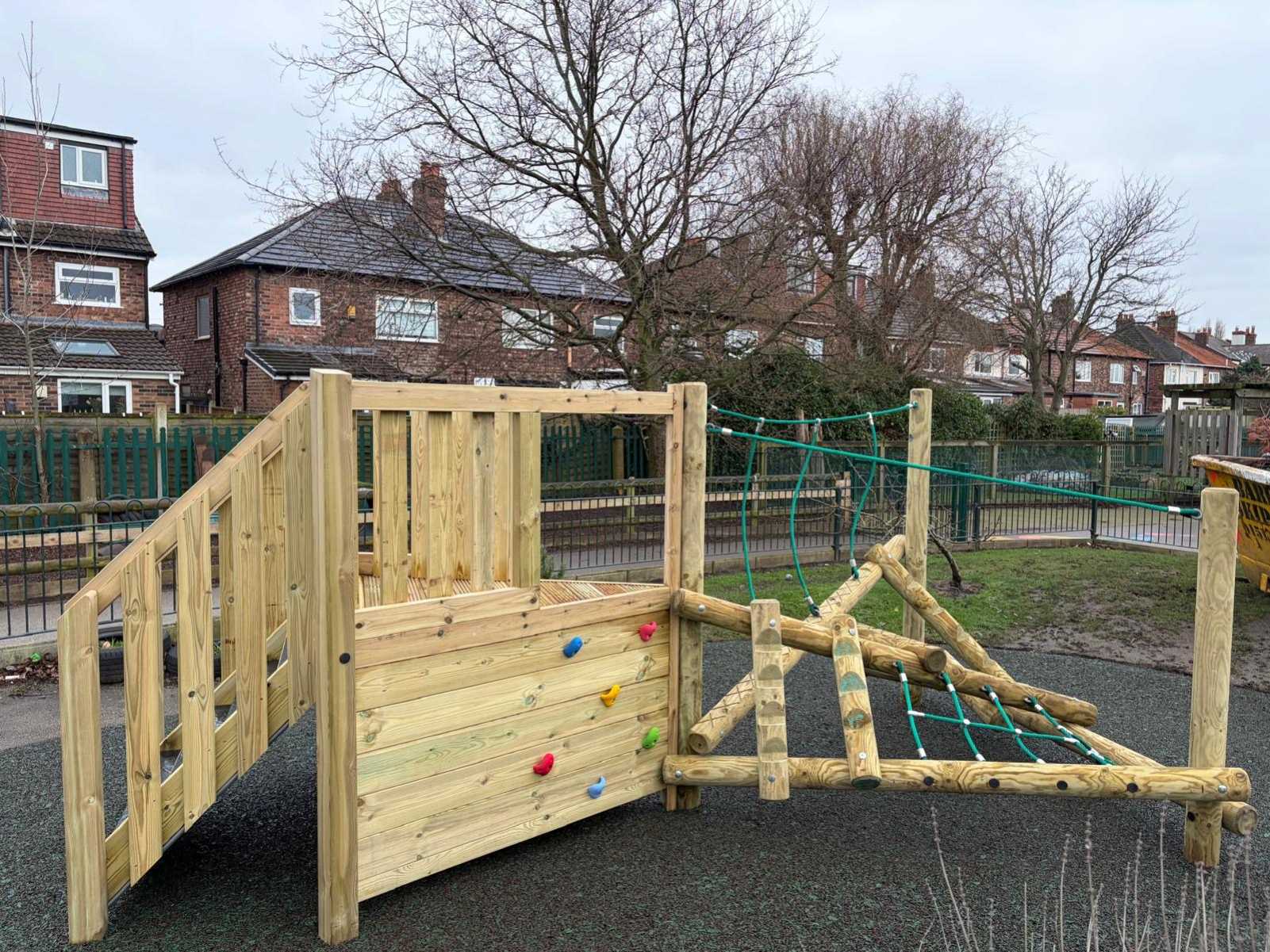 The Clamberstack Midi with platform is specifically designed to encourage physical development, featuring large timber logs that children can climb across to build coordination and balance. Integrated ropes allow pupils to stretch, steady themselves, and challenge their movement skills, while the rock traverse and stepped access to the platform offer further opportunities to develop strength, confidence, and agility through play.