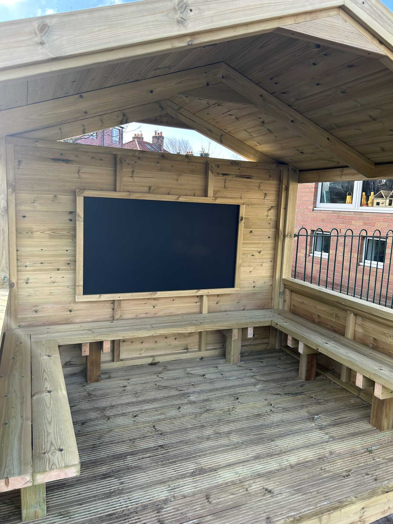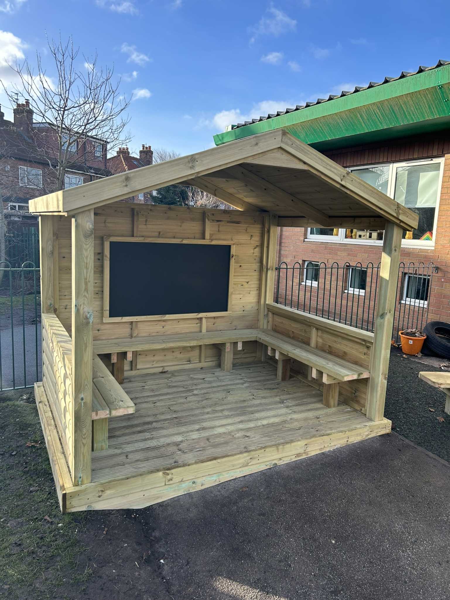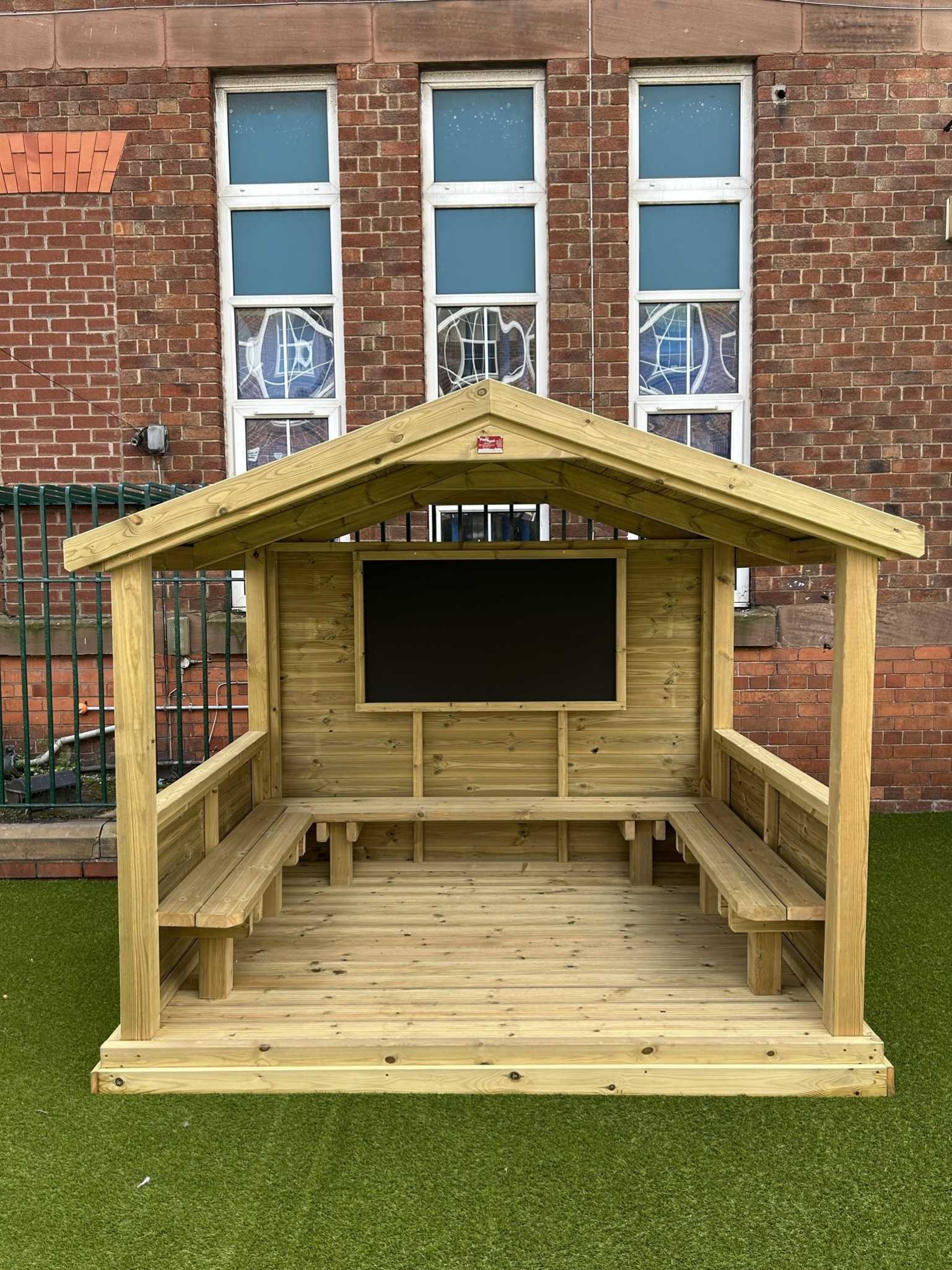 Our Role Play Cabin features a spacious open area, ideal for group performances, setting up a stafe or transforming into a shop offering endless imaginative possibilities. With an interior mounted seating and a mounted chalkboard, it encourages creative expression, social interaction, and the development of communication and fine motor skills in early years.