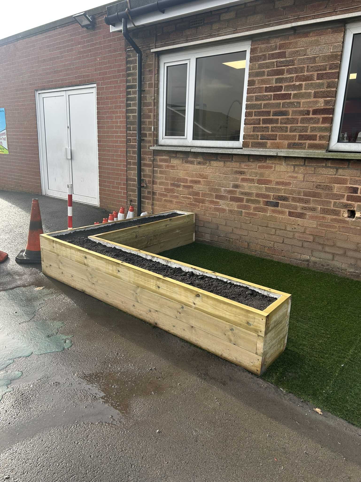 This attractive L shaped planter can fit in any corner and comes complete with bench along the front - perfect for relaxing among flowers, herbs, or greenery.